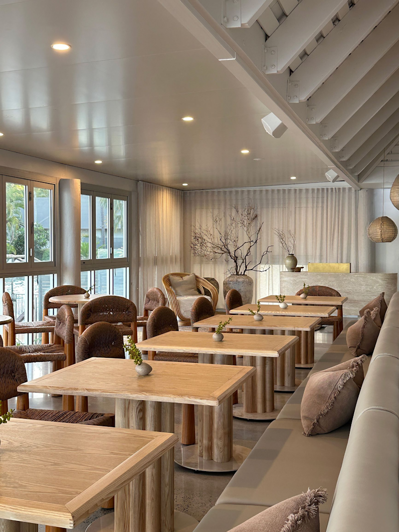 A contemporary Asian restaurant set on the beachfront, Coca Chu is defined by high tropical ceilings, natural timber and soft coastal light. The space features artwork by Daimon Downey, with materials sourced both locally and internationally, and all decorative elements drawn from the island itself. Its easy rhythm and coastal energy complement neighbouring venues designed by Loopcreative, including Romano’s, The Palms, Sails Beachfront Pool Bar, and a late-night Japanese Izakaya.
